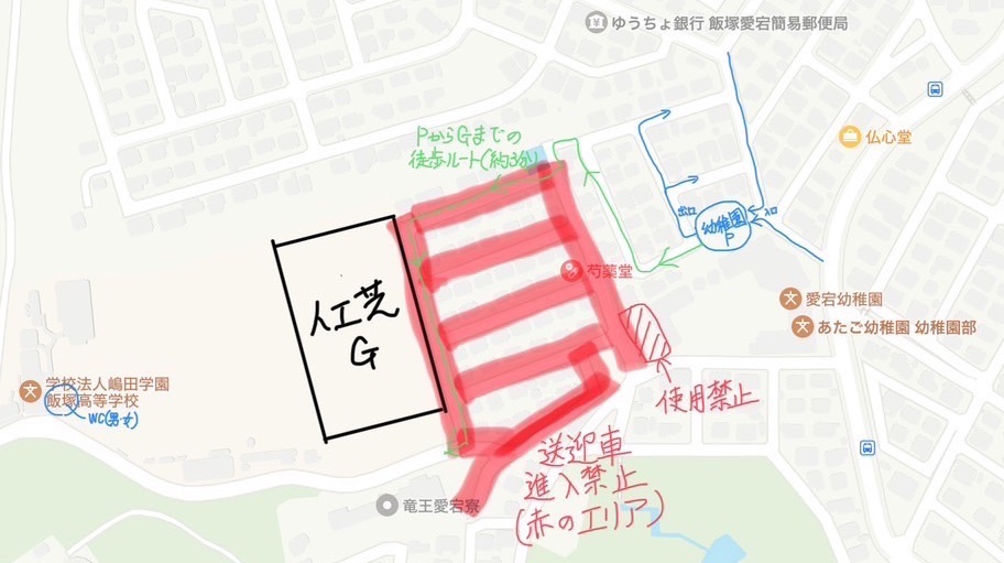 ※地図上の青ペンで記入している場所が保護者駐車場です。