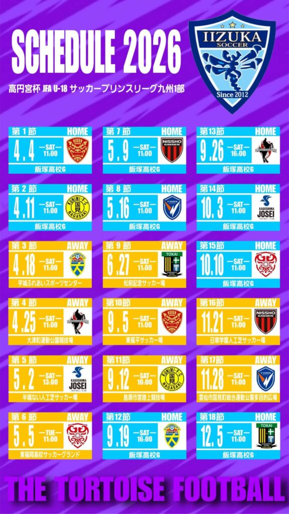 4月4日(土)に開幕戦を迎える、「高円宮杯 JFA U-18サッカープリンスリーグ2026 九州1部」の試合日程が公開されています。これにあわせて、飯塚高校サッカー部ではシーズンカレンダーを制作いたしました。